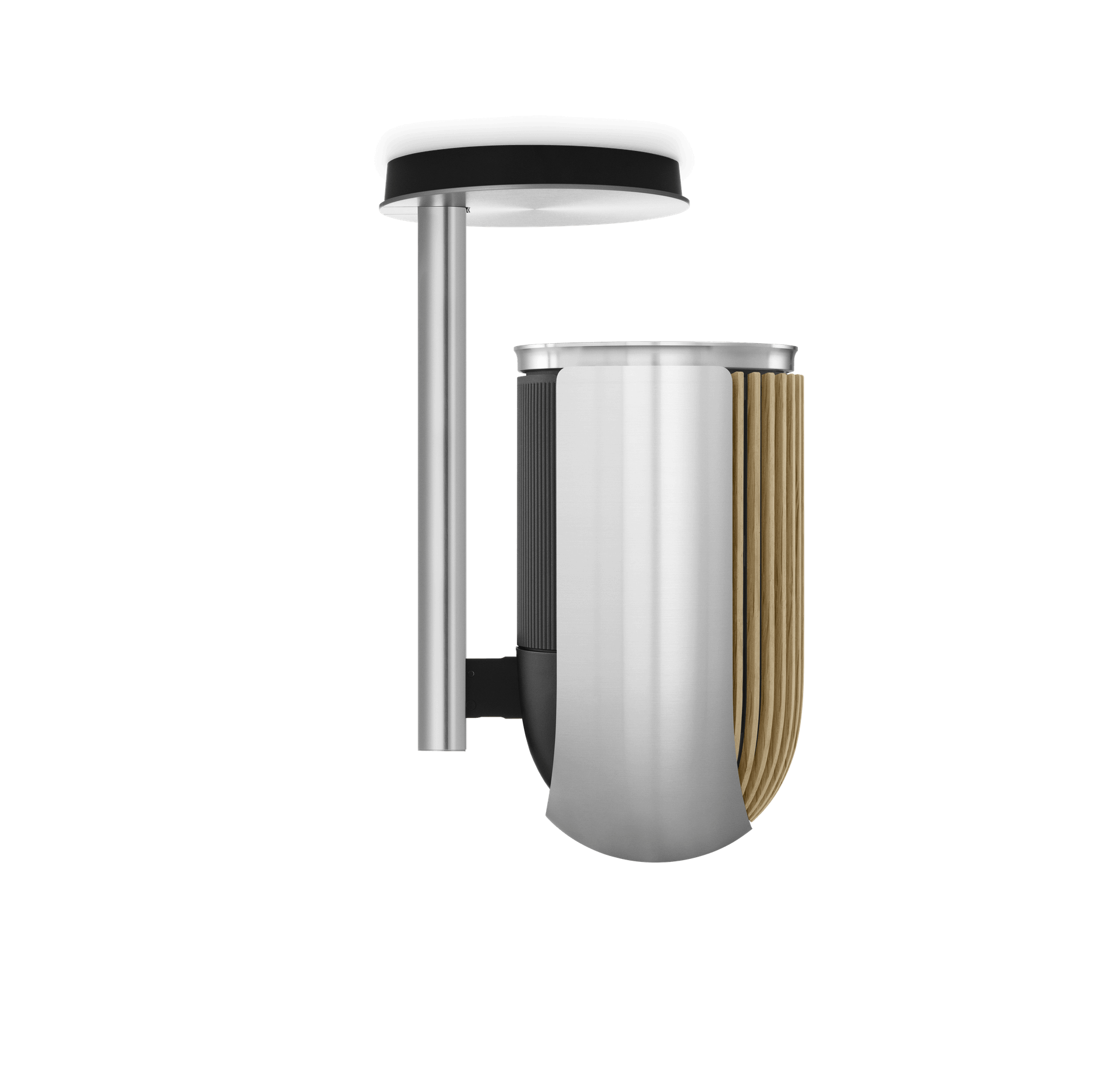 Each of the four stand options is a piece of art. Slender. Sculptural. Combined with a selection of different cover materials. From textured fabric to bands of solid oak.