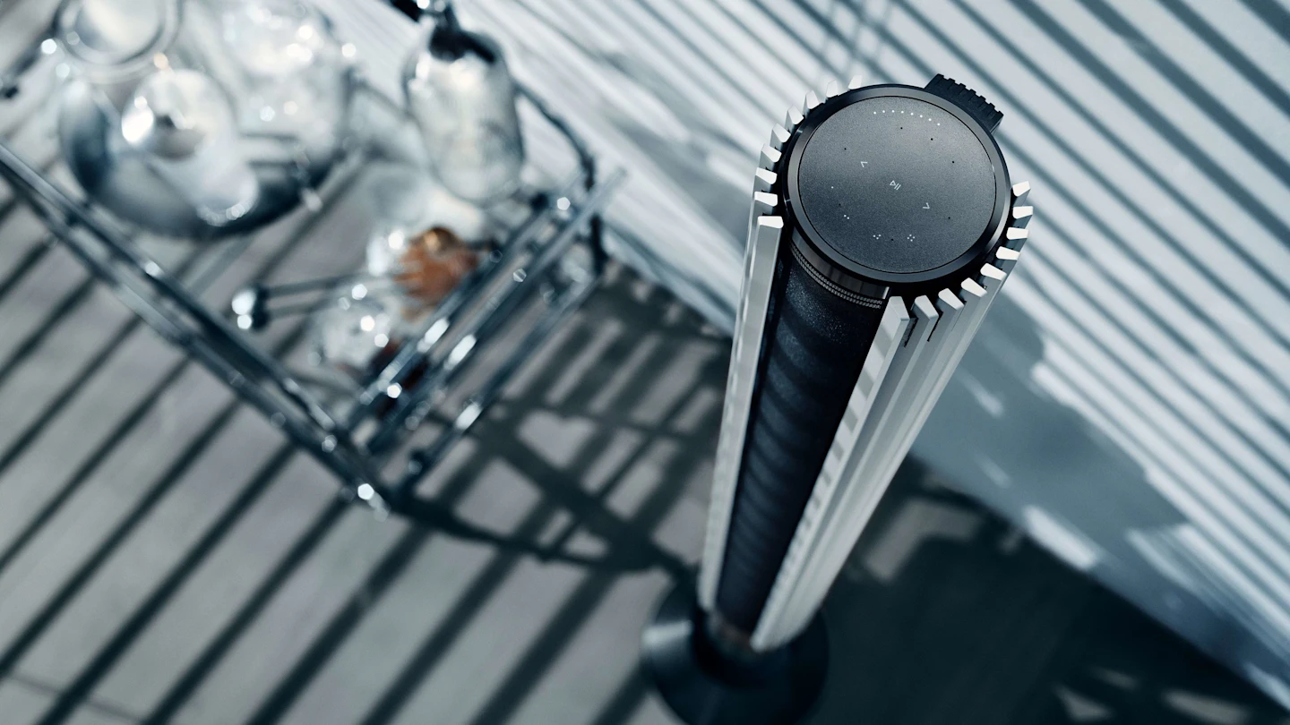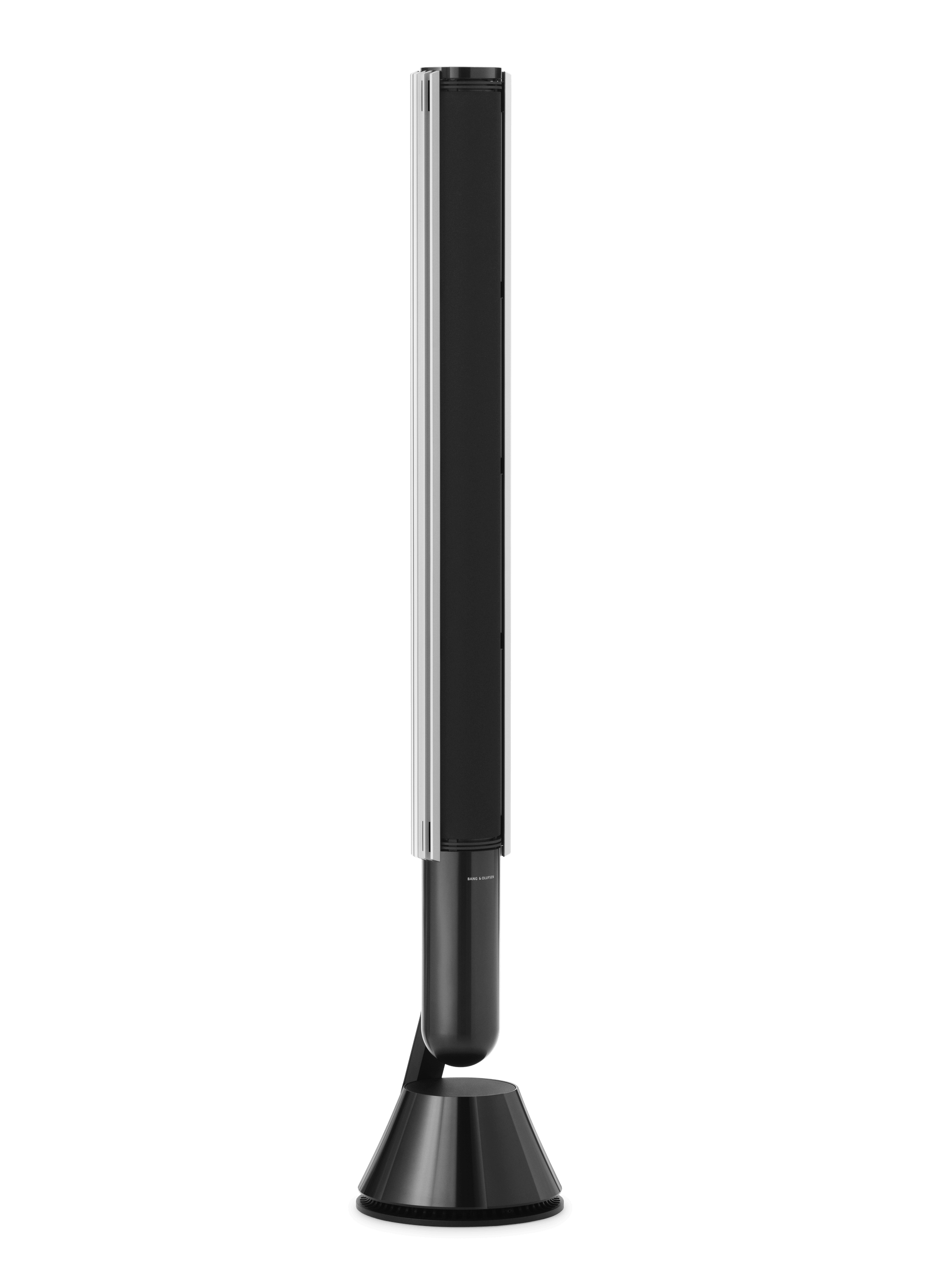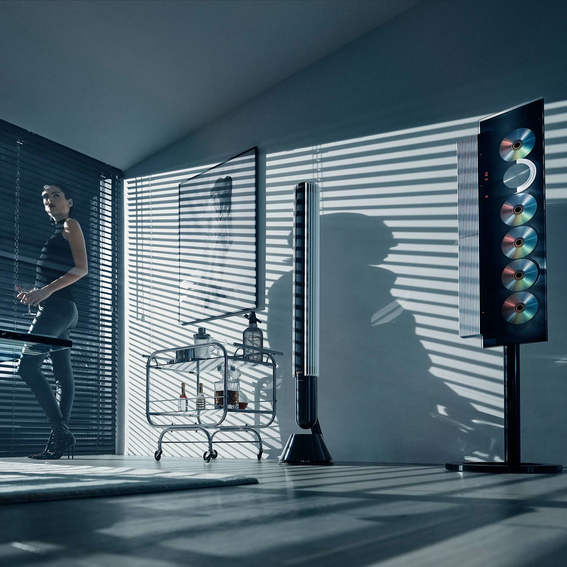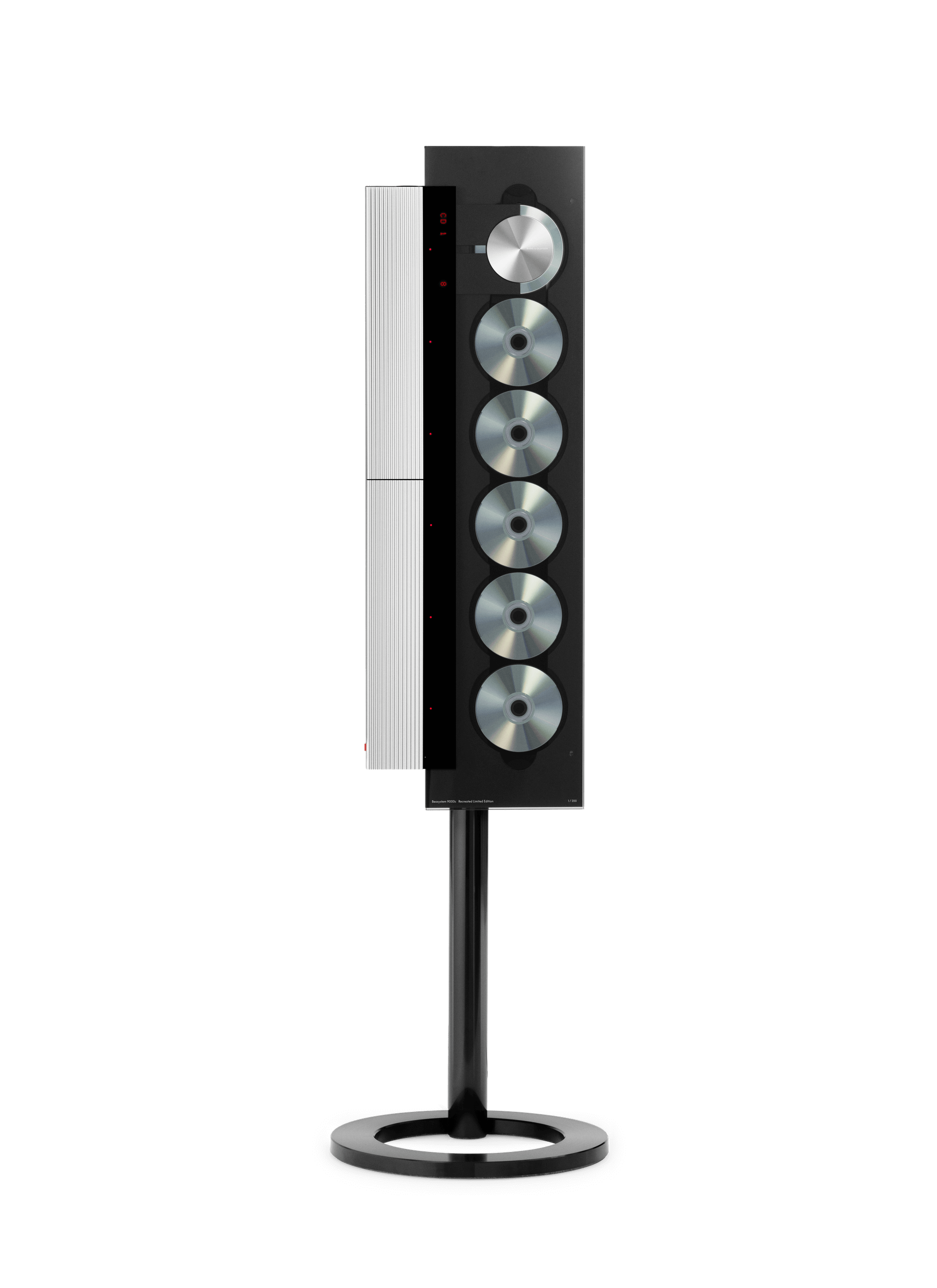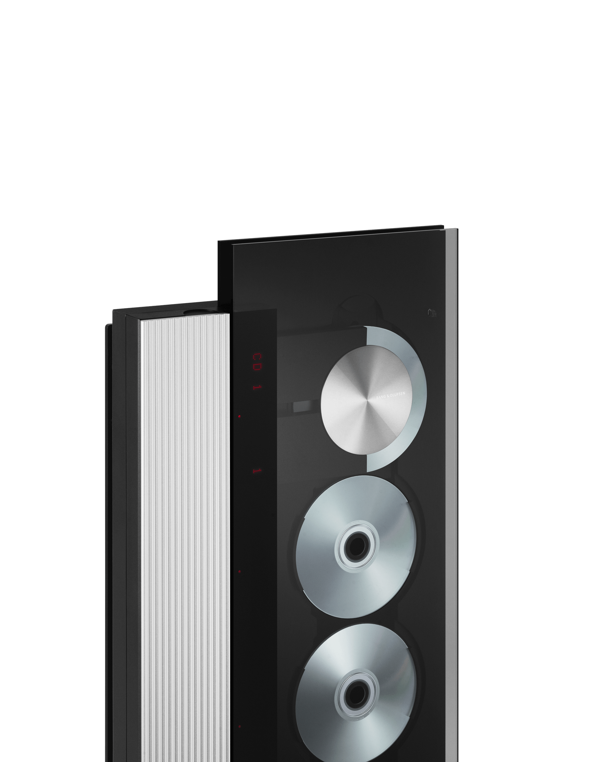 The elegant interactive lid of the vertical CD player chimes perfectly with the Beolab lamellas. Its floor stand equals their darkness and depth. For a futuristic-looking trio that transcends space and time – born in the same factory, two decades apart.