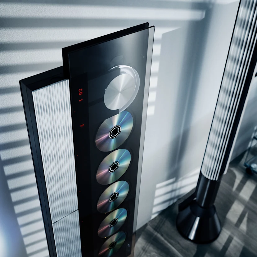The Beosystem 9000c is a beacon of beautiful sound, and your personal record store window. Select your CDs. Display them in the iconic vertical player. And bask in a masterwork of artistry and engineering.