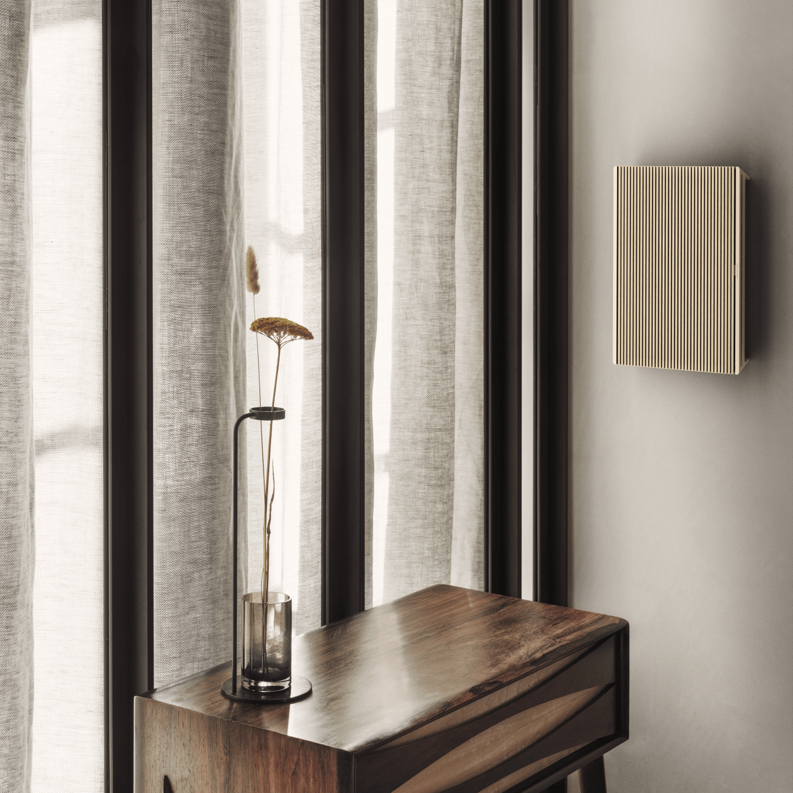 An attractive, optional wall mount for Beosound Level offers instantly elegant charging. Once locked in place, the speaker powers up ready for the next move.