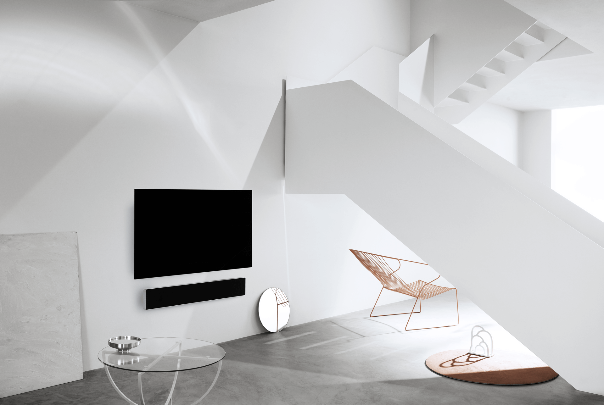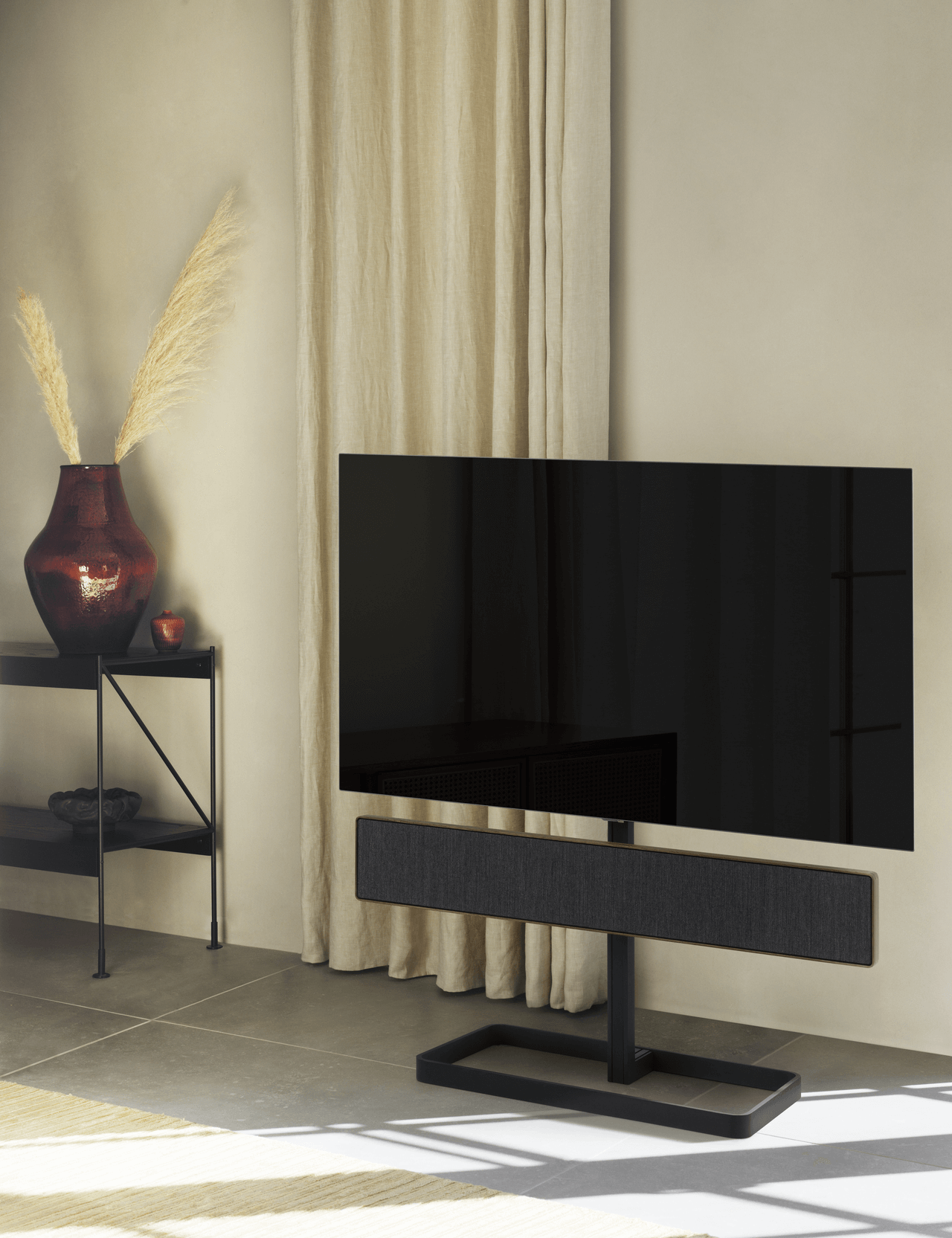 Place your Beosound Stage soundbar and your TV on a minimalist-designed Bang & Olufsen floorstand to create an interrelated and freestanding TV experience.
