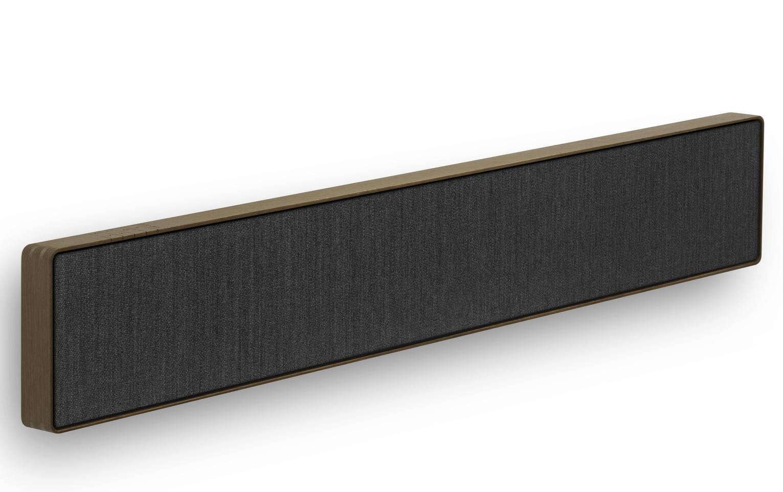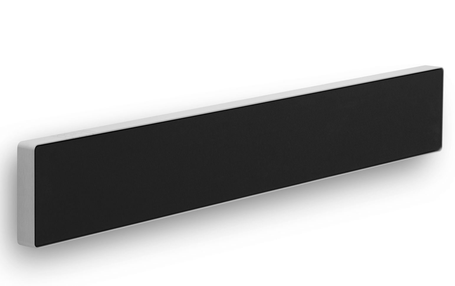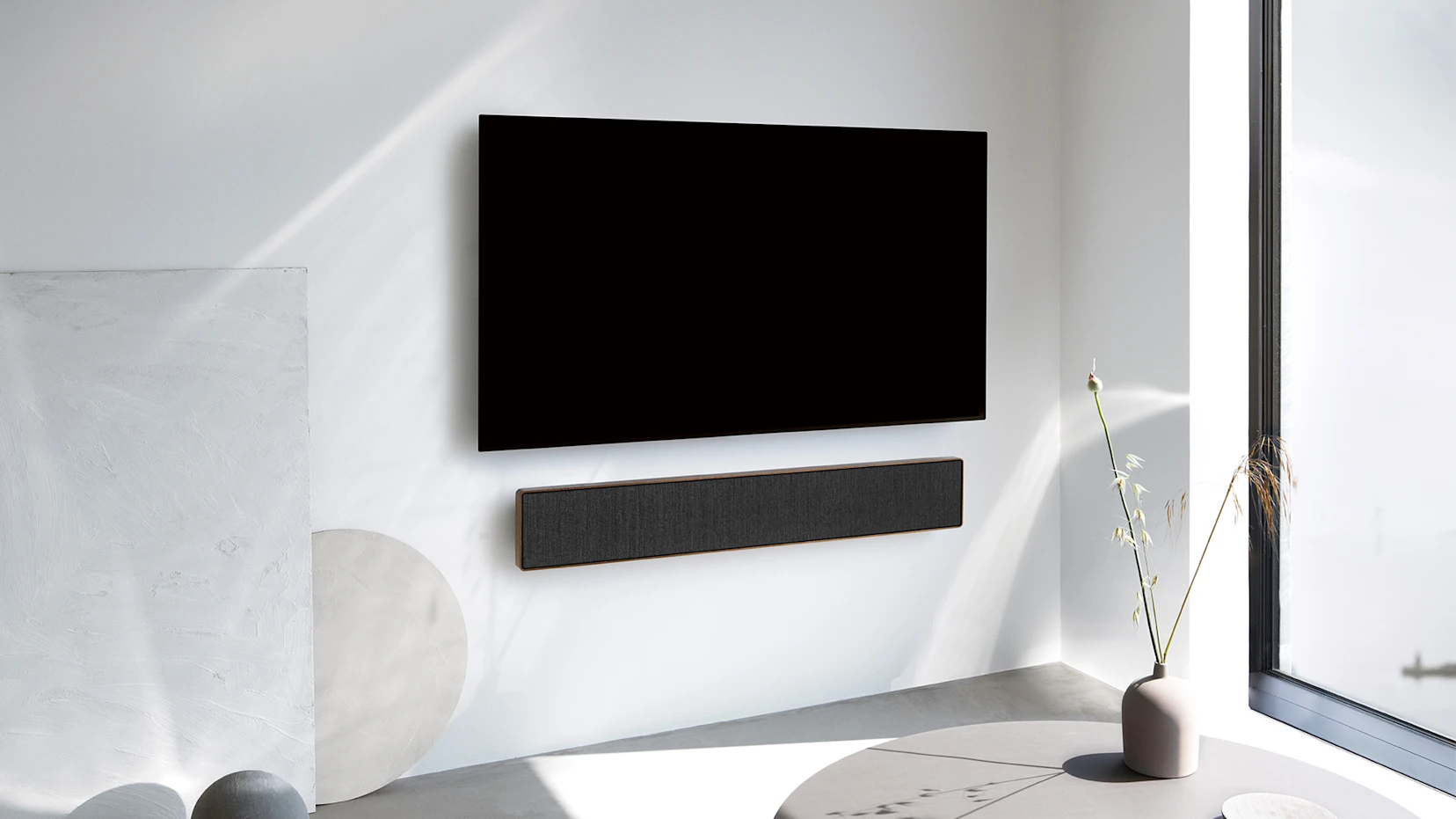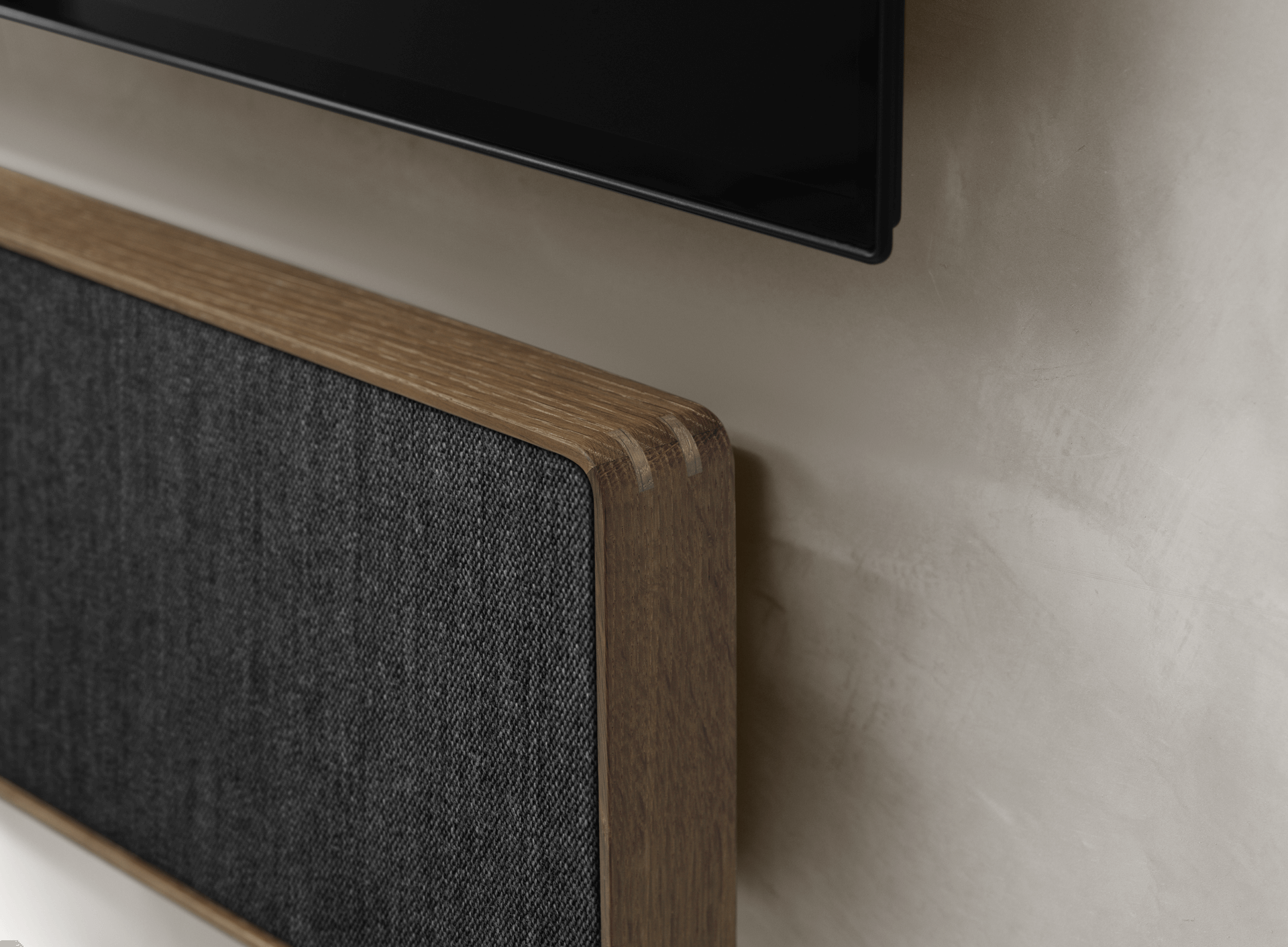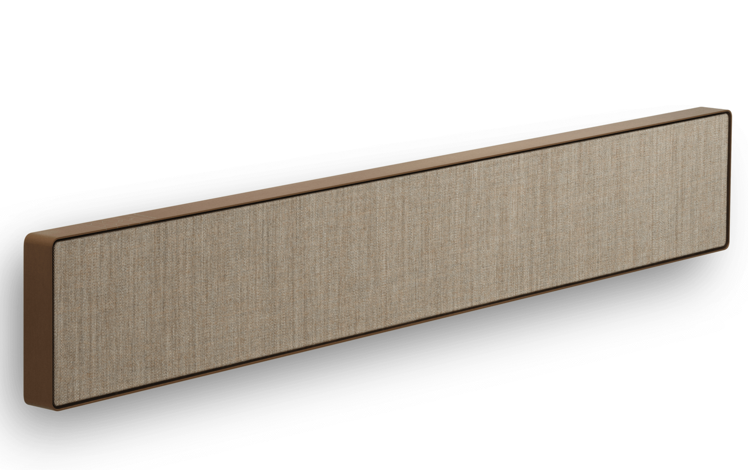 The control buttons integrate seamlessly, a visual continuation of the infinite frame. A deliberate gap between the frame and the fabric cover highlights the contrast from the aluminium to the warm fabric. Beosound Stage brings expressive minimalism to any interior – while maximising the TV experience.