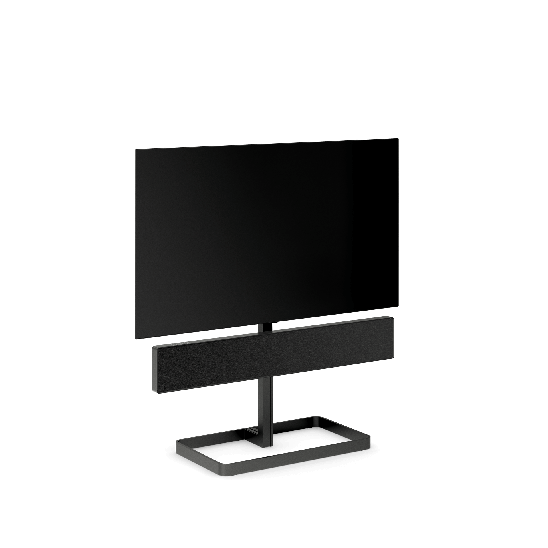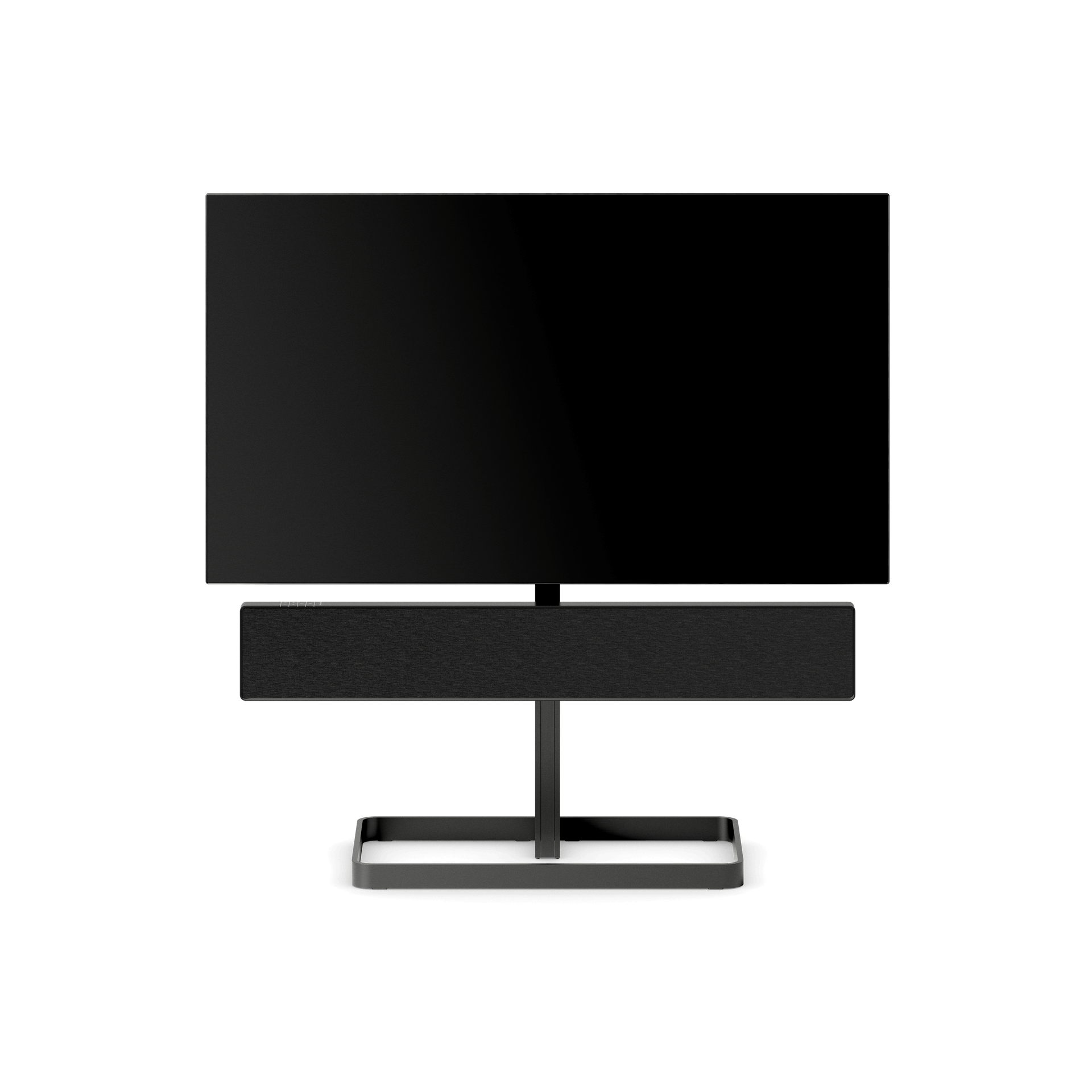 The floor stand has been created from a simple profile with soft corners to mimic the frame around Beosound Stage. The 16:9 ratio shape of the base is inspired by the shape of the TV screen, resembling a kind of shadow on the floor. The stand is painted black with a subtle structure that fits the overall design.