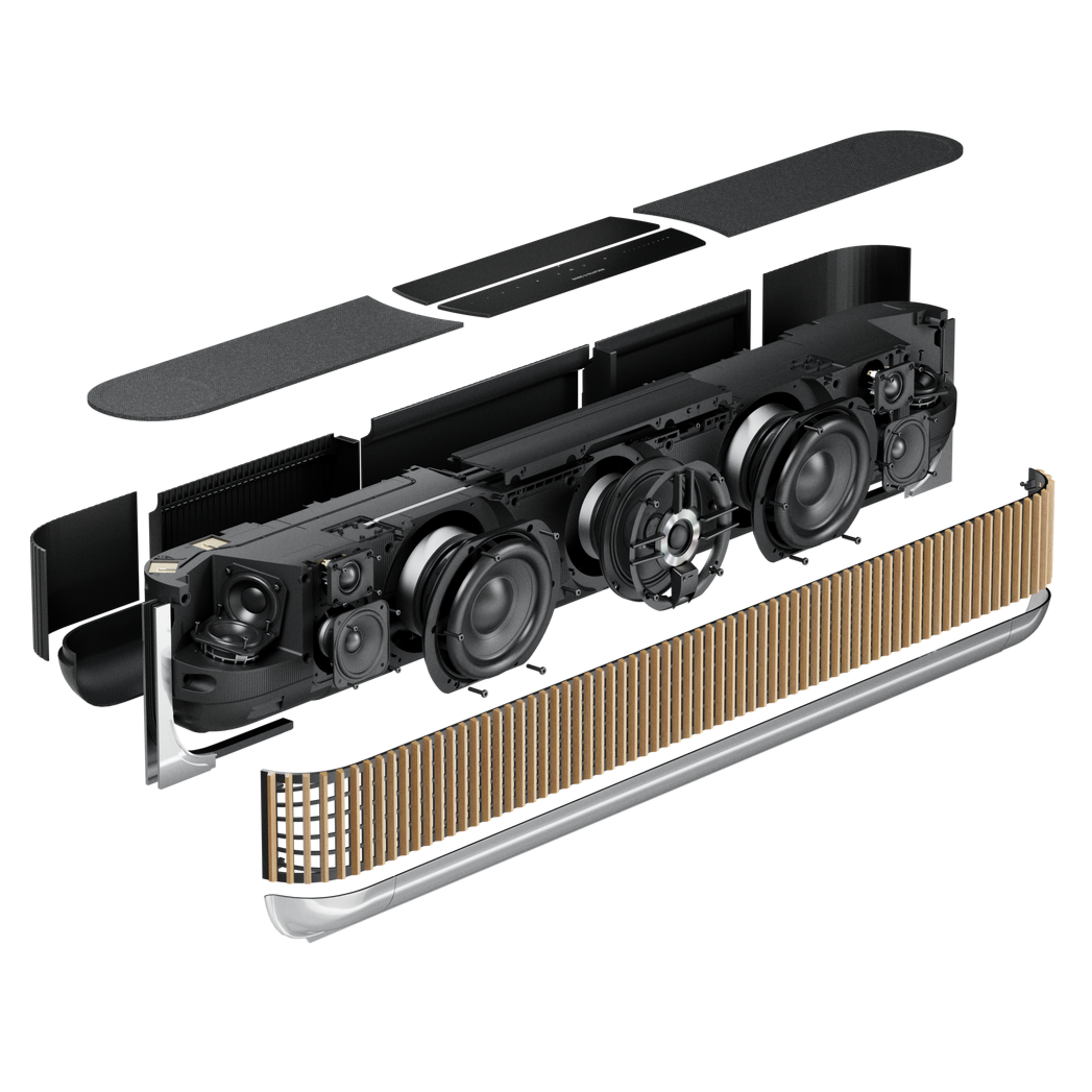 Beosound Theatre doesn't just lead from the front. Twelve custom drivers direct sound above, below and to the sides of your screen, creating a room-filling soundscape that immerses you in the moment. Dolby Atmos allows for true surround sound experiences, and a coaxial centre channel ensures crisp and clear speech. You won’t miss a word or whisper.